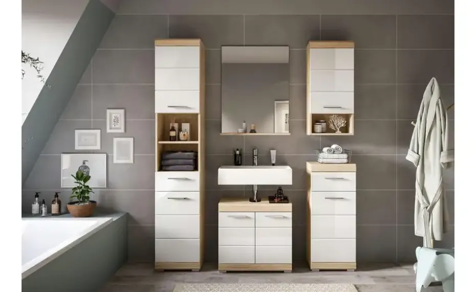 Entdecken Sie die perfekte Kombination aus Stil und Funktionalität für Ihr Badezimmer mit unserer Badkombination in Sonoma Eiche hell und weißem Hochglanz. Sie bietet bietet ausreichend Stauraum und verleiht Ihrem Raum einen modernen und ansprechenden Look. Tauchen Sie ein in zeitlose Eleganz und optimale Organisation mit diesem einzigartigen Möbelstück.