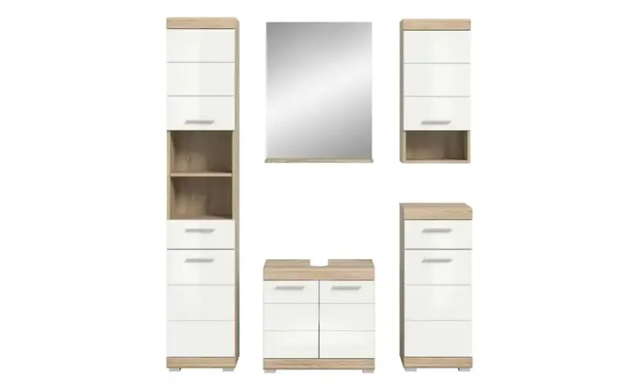 Badmöbel-Set SCHLOONSEE, 5 teilig, bestehend aus: Hochschrank, WBU, Spiegel, Unterschrank, Hängeschrank Schloonsee | Eiche Sonoma (Nachbildung), Weiß, hochglanz