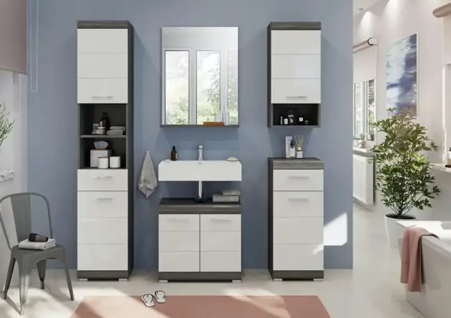 Verleihe deinem Badezimmer den ultimativen Style mit unserer Badkombination in angesagtem Rauchsilber Nachbildung und weißem Hochglanz tiefgezogenem Finish. Mit ihrem trendigen Design und der hochwertigen Verarbeitung setzt sie ein modernes Statement in deinem Zuhause. Entdecke jetzt die perfekte Verbindung von Coolness und Funktionalität für dein Badezimmer!