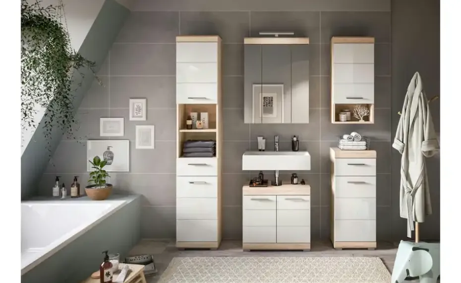 Entdecken Sie die perfekte Kombination aus Stil und Funktionalität für Ihr Badezimmer mit unserer Badkombination in Sonoma Eiche hell und weißem Hochglanz. Sie bietet bietet ausreichend Stauraum und verleiht Ihrem Raum einen modernen und ansprechenden Look. Tauchen Sie ein in zeitlose Eleganz und optimale Organisation mit diesem einzigartigen Möbelstück.
