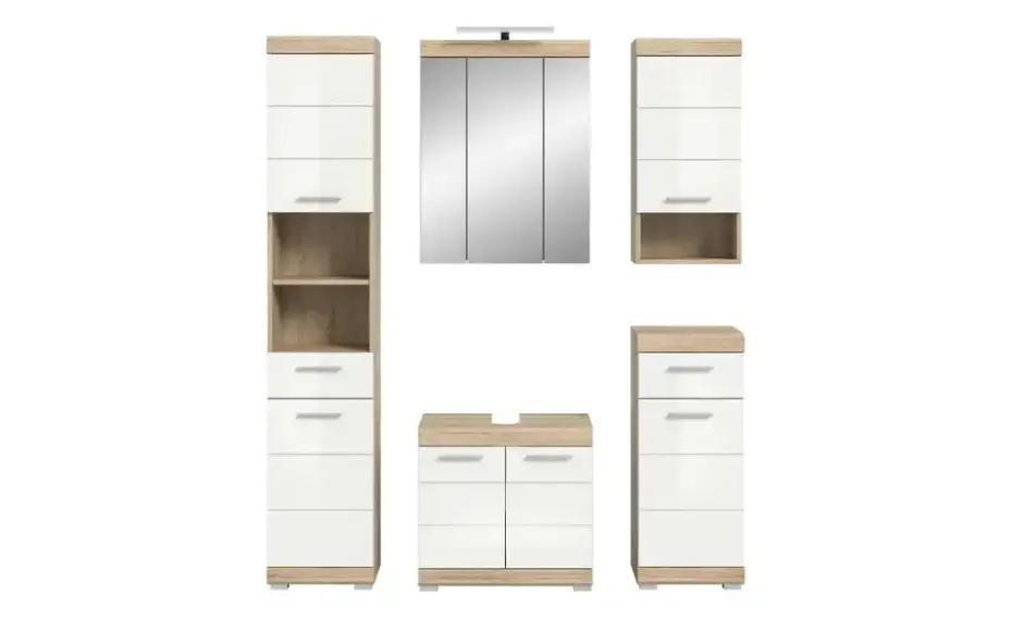 Badmöbel-Set SCHLOONSEE, 5 teilig, inklusive LED Beleuchtung, bestehend aus: Hochschrank, WBU, Spiegelschrank, Unterschrank, Hängeschrank Schloonsee | Eiche Sonoma (Nachbildung), Weiß, hochglanz