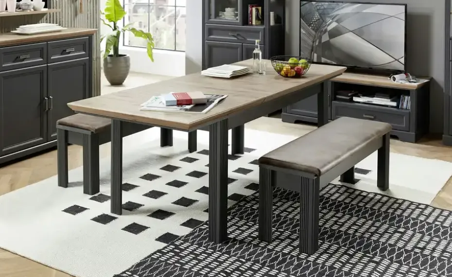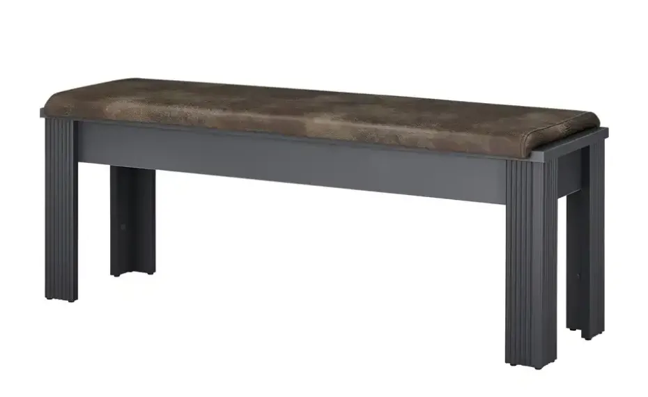Die Landhaus-Bank Varese ergänzt den gleichnamigen Esstisch oder kann auch so als Sitzgelegenheit genutzt werden. Ihre Sitzfläche ist 122 cm breit und bietet Platz für zwei Personen. Dank des dick gepolsterten Klemmkissens sitzt man bequem. Der Bezug besteht aus einem soften Mikrovelour und hat eine schöne braune Farbe. Sie harmoniert mit dem Graphitgau des Gestells.