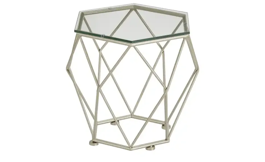Der Beistelltisch Urban Scandi fällt durch sein geometrisches Design ins Auge. Das extravagante Gestell ist aus Metall und pulverbeschichtet. Der Champagnerton hat einen leichten Glanz und wirkt sehr edel. Die Tischplatte in Form einer Wabe ist aus stabilem Glas.