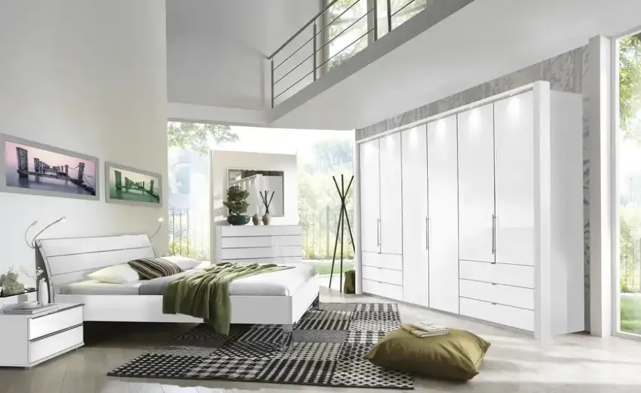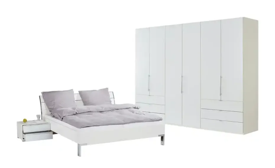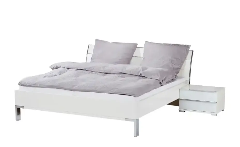 Mit ihrem alpinweißen, modernen Look schafft die Bettanlage Beda eine schöne Basis für eine traumhafte Schlaf-Atmosphäre. Das Kopfteil ist dezent geschwungen und wird mit verchromten Leisten abgesetzt. Der Chromlook wird von den Füßen in Winkelform und an den Nachtkommoden gekonnt aufgegriffen. Gleicht zwei Nachtkonsolen sind im Lieferumfang enthalten. Sie verfügen über jeweils zwei Schubladen als praktischer Stauraum. Ihre Front ist aus edlem Glas gefertigt. Sie können Beda mit Lattenrosten und Matratzen nach Wunsch ergänzen. Sie sind separat erhältlich.