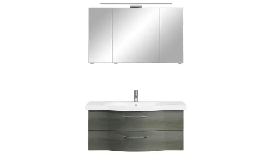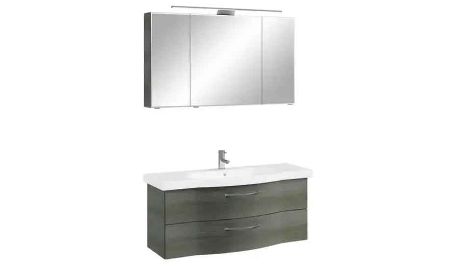 Mit der Badezimmerkombination Rovana von calmo bekommt Ihr Bad einen praktischen und dekorativen Mittelpunkt. Zentrales Element ist selbstverständlich der Waschtisch. Er ist aus weißer Keramik gefertigt und hat ein elegant-geschwungenes Design. Passend dazu: der Unterschrank, der die gerundete Front des Waschtisches aufgreift. Der Spiegelschrank ist hingegen geradlinig gestaltet. Rovana hat ein edles Dekor in Graphit Struktur quer (Nachbildung). Den vielseitigen Stauraum können Sie für all die Dinge der täglichen Körperpflege nutzen. In den neun Innenfächern des Spiegelschrankes und in den Auszügen des Unterschrankes ist ausreichend Stauraum zu finden.