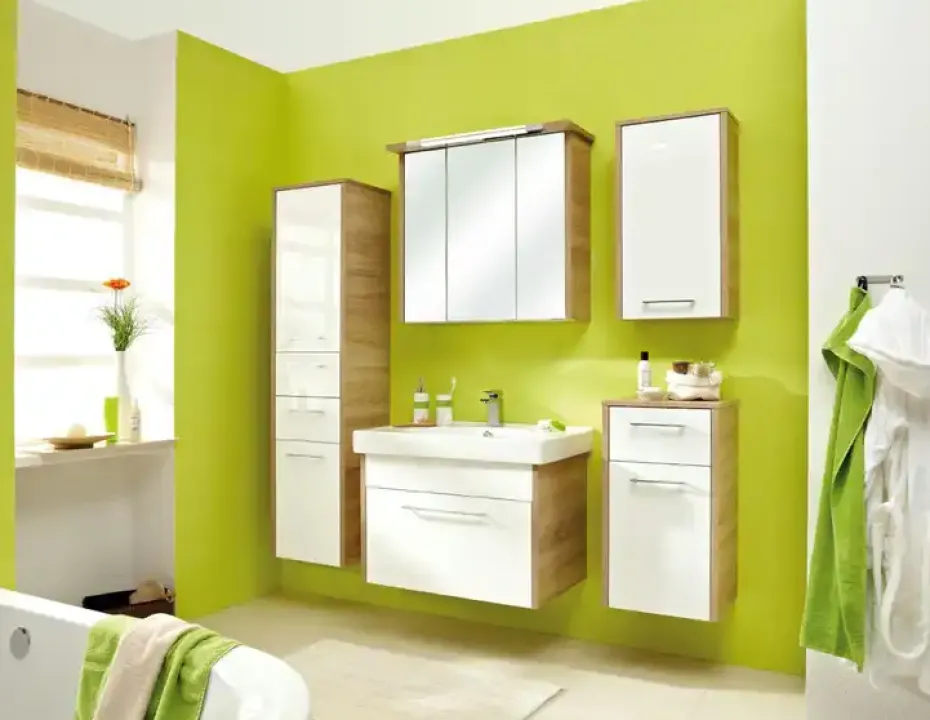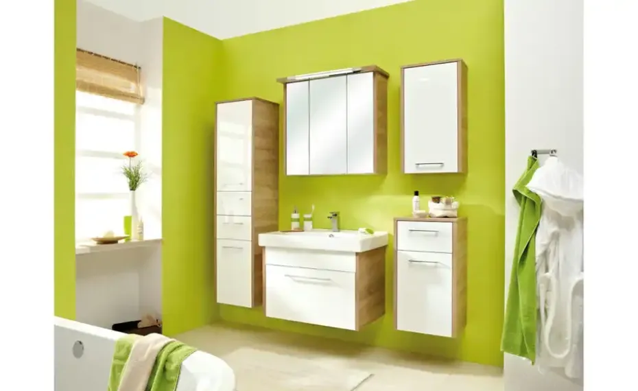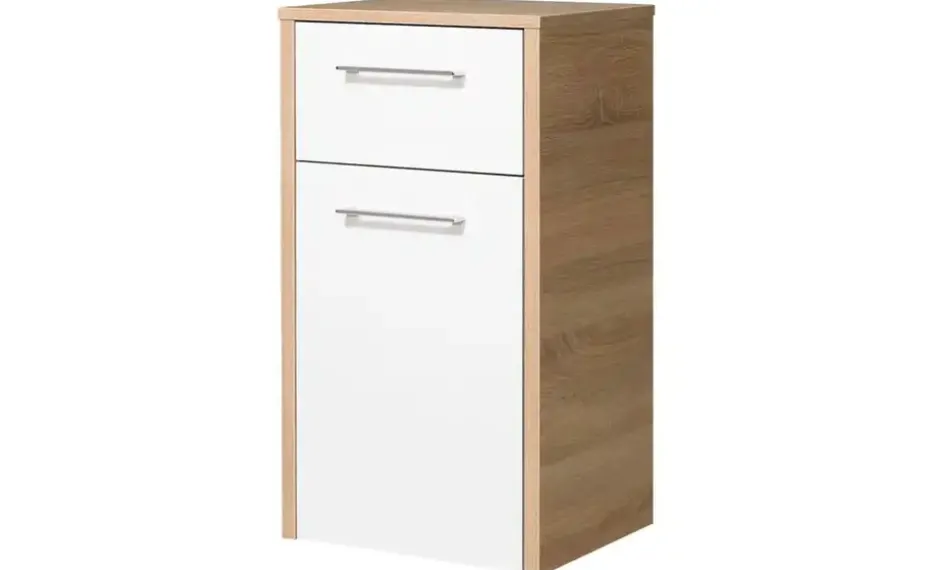 Qualität Made in Germany ist der Badschrank Bodensee. Der Schrank ist hochwertig gearbeitet und ansprechend, zeitlos designt. Durch das Eiche Natur Dekor (Nachbildung) kommt der weiße Farbton der Front besonders gut zur Geltung. Die dezente Farbe wirkt durch den Hochglanz noch edler und eleganter. Die beiden Metall-Bügelgriffe setzen durch ihre verchromte Oberfläche Akzente. Bodensee ist mit einer Schublade und einer Tür ausgestattet. Den Türanschlag können Sie nach Bedarf wechseln. Durch den integrierten Dämpfer schließt die Tür leise. Die zwei Fächer hinter der Tür werden von einem Glasboden getrennt. Um die Größe der Fächer zu variieren, brauchen Sie nur den Boden in der Höhe zu verstellen. Übrigens: durch die separat erhältlichen Füße können Sie Bodensee nicht nur an die Wand hängen, sondern auch aufstellen.
