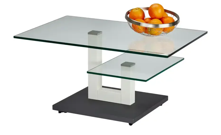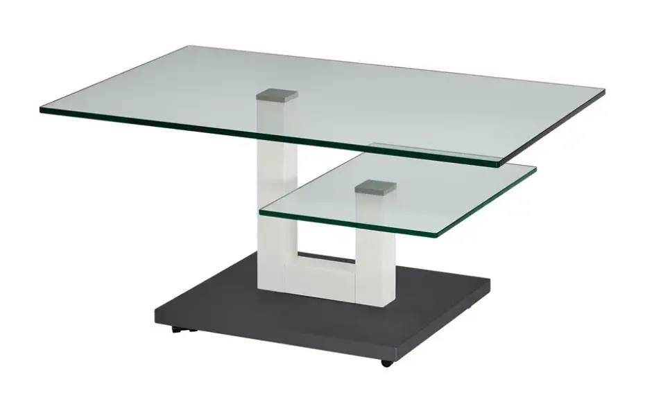 Der Couchtisch Hadar ist nicht nur attraktiv anzuschauen, sondern auch praktisch. Das macht ihn zum Highlight Ihres Wohnzimmers. Der Tisch besteht aus hochwertigen Materialien und ist mit dem Gütesiegel Made in Germany ausgezeichnet. Hadar verfügt über ein zweigeteiltes Säulengestell, dass Tischplatte und Ablage trägt. Die beiden Säulen sind weiß lackiert und setzen sich somit von den Glasplatten ab. Diese bestehen beide aus Klarglas und sind transparent. Einen dramatischen Kontrast stellt die Bodenplatte dar. Sie ist anthrazitfarben. Praktisch: Hadar ist mit Rollen ausgestattet und kann dadurch flexibel bewegt werden.