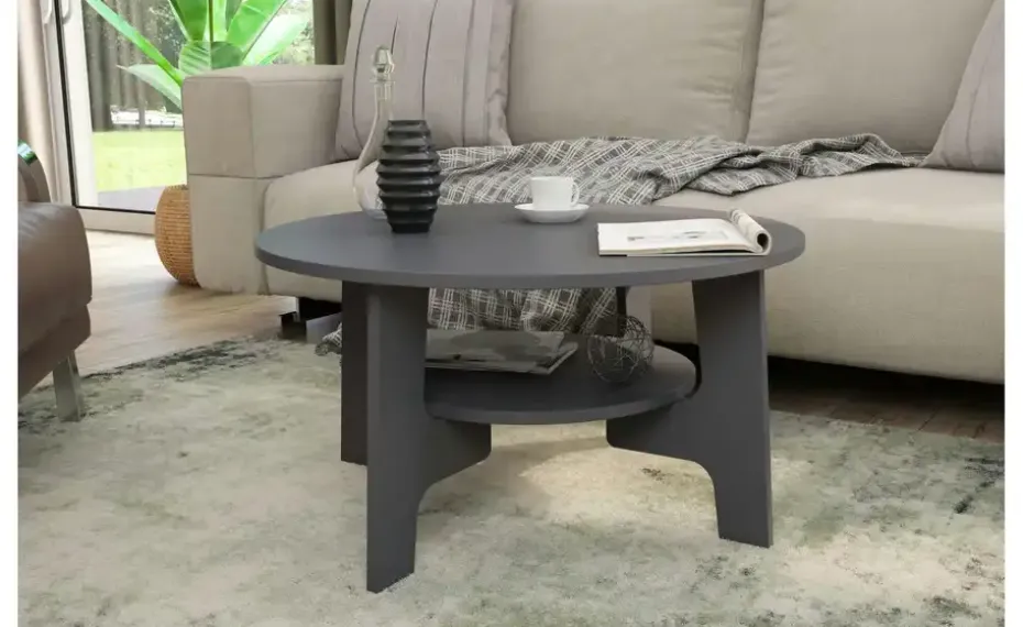 Dieser Couchtisch bietet dank seiner zwei Ablagemöglichkeiten extra viel Platz und Möglichkeiten. Genießen Sie einen Filmeabend mit Snacks und verstauen Sie lose Zeitschriften und Deko so lange auf der unteren Ablagefläche. Für Kaffee und Kuchen bietet die großzügige Tischplatte ebenfalls ausreichend Platz. Dank der anthrazitfarbenen Lackierung lässt sich der zeitlose Couchtisch zu nahezu allen Wohnstilen kombinieren.