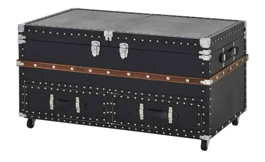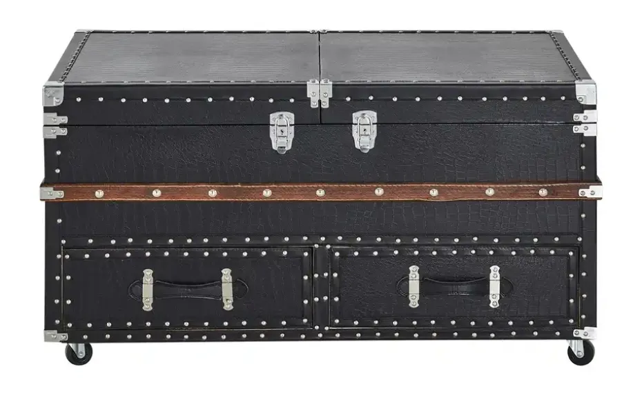Truhe oder Couchtisch? Teramo ist beides. Der bewegliche Couchtisch im Truhendesign sieht nicht nur klasse aus, sondern bietet auch praktischen Stauraum. Teramo ist mit schwarzem Kunstleder in Kroko-Optik bezogen. Akzente aus dunkler Kiefer und helle Metallnieten verleihen ihm das gewisse Etwas. Ziehen Sie die Tischplatte auseinander: Hier finden Sie ein herausnehmbares Tablett und ein integriertes Flaschenregal mit Platz für zehn edle Tropfen. Im unteren Bereich des Couchtisches gibt es zwei Schubkästen je Seite. Verstauen Sie hier zum Beispiel Magazine und Fernsehzubehör. Dank der leichtgängigen Rollen können Sie den Truhentisch problemlos bewegen.