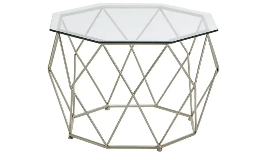 Der Beistelltisch Urban Scandi fällt durch sein geometrisches Design ins Auge. Das extravagante Gestell ist aus Metall und pulverbeschichtet. Der Champagnerton hat einen leichten Glanz und wirkt sehr edel. Die Tischplatte in Form einer Wabe ist aus stabilem Glas.