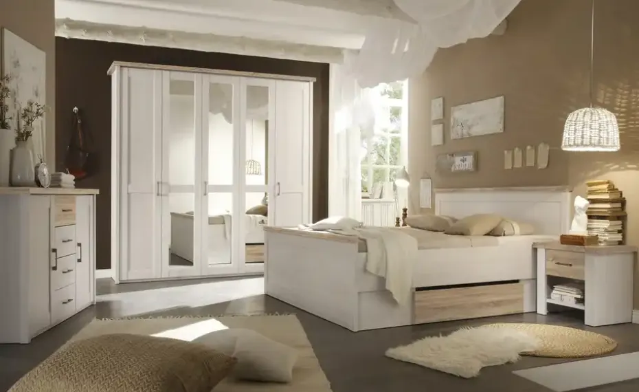 Geräumig und vielseitig präsentiert sich der 5-türige Drehtürenschrank Lancaster, der in Ihrem Schlafzimmer auf zuverlässige Weise für Ordnung sorgen kann. Hinter fünf Türen verbergen sich verschiedene Fächer für Ihre Kleidung. Auf den Kleiderstangen können Sie außerdem Hemden und Jacken aufhängen. Die drei mittleren Türen sind außen verspiegelt und ermöglichen Ihnen, sich von Kopf bis Fuß betrachten zu können. Die schlichte und moderne Optik des hölzernen Kleiderschranks wird durch Griffe in Metalloptik und eine holzfarbene Leiste auf dem Schrank auf gekonnte Weise unterstrichen.