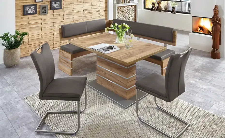Eckbänke nutzen Ecken praktisch aus und bieten eine große Sitzfläche. Deshalb empfehlen wir die Eckbank Mira von uno. Sie ist L-förmig designt und verfügt so über Sitzplätze für mehrere Personen. Sitz- und Rückenfläche werden mit dicken Polstern ergänzt, damit Sie es bequem haben. Ihr Bezug besteht aus einer weichen Mikrofaser. Ein schöner Kontrast zum Gestell, das in Struktureiche Terra (Nachbildung) designt ist. Die Gestellwangen werden mit Metall-Applikationen akzentuiert.