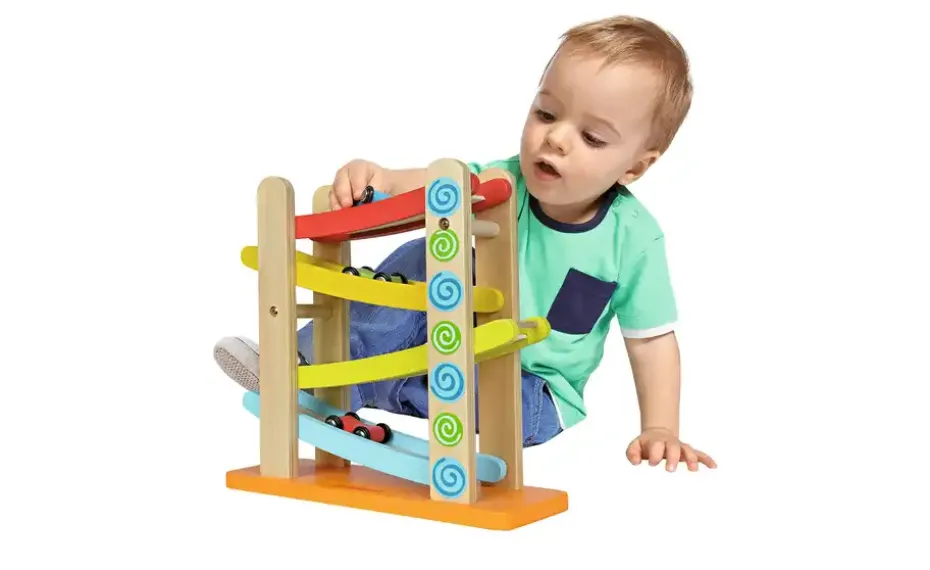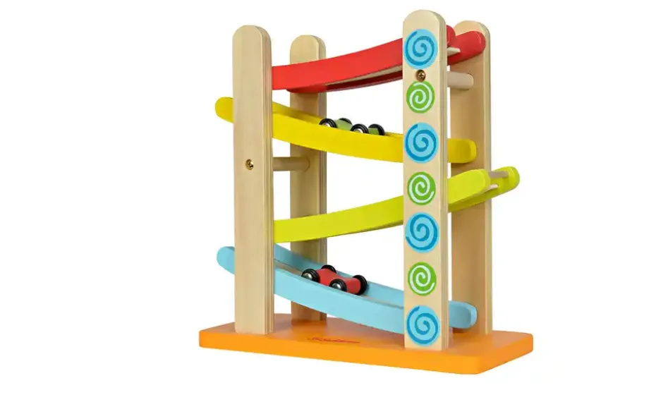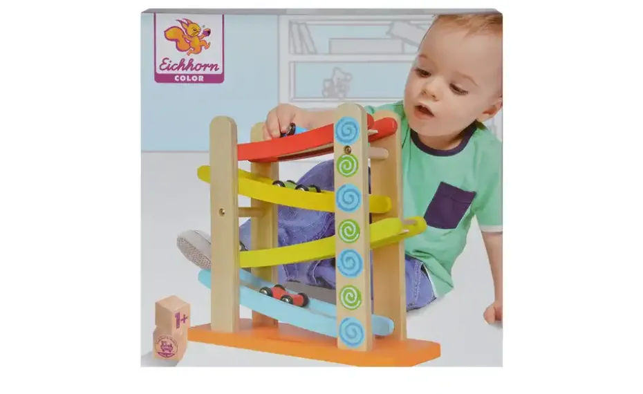Eichhorn Color Autorennbahn: Die Eichhorn Color Autorennbahn mit den vier Etagen sieht klasse aus und ist für Kinder eine wunderbareBeschäftigungsmöglichkeit. Die Autos können von der oberen Etage bis zur letzten nach unten fahren, denn die einzelnen Ebenen sind anden Enden so konstruiert, dass die Autos im Zick-Zack-System nach unten rollen. Für Kinder ab einem Jahr geeignet.