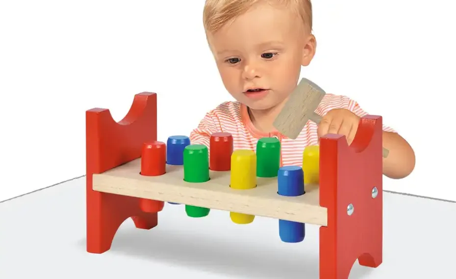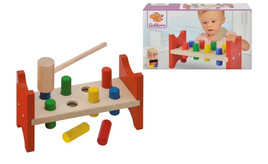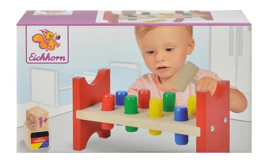 Eichhorn Klopfbank: Die 8 bunten Stifte müssen mit dem Hammer durch die Löcher der 9×23,5×13,5cm großen Eichhorn Klopfbank geschlagen werden. Die Klopfbank fördert die Motorik und ist für Kinder ab einem Jahr geeignet. Für die Herstellung der Eichhorn Klopfbank wird ausschließlich FSC® 100% Holz aus nachhaltiger Forstwirtschaft verwendet.