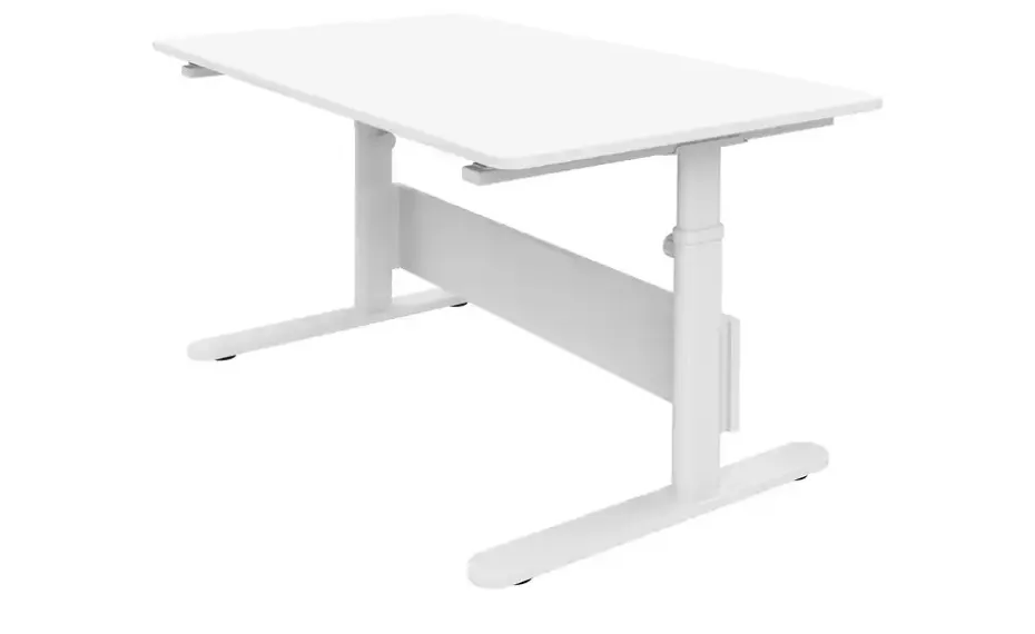 Der Schülerschreibtisch Evo von FLEXA lässt sich passend zur Größe des Kindes anpassen. So wächst er mit dem Kind mit und ermöglicht eine ergonomische Haltung beim Sitzen und Hausaufgaben machen. Die Höhe der Tischplatte wird mittels eines seitlichen Stellknopfes und eines Federsystems angepasst. Das ist von 56 bis 79 Zentimeter Höhe möglich. Auch die Neigung der Tischplatte ist leicht verstellbar. Durch einen Gasdruckdämpfer geht das kinderleicht. Ein Klemmlineal für die Tischplatte ist im Lieferumfang enthalten. Um den weißen Tisch etwas aufzupeppen, können Sie die mitgelieferten farbigen Kunststoffkappen nutzen. Sie werden vorne an den Tischbeinen befestigt.