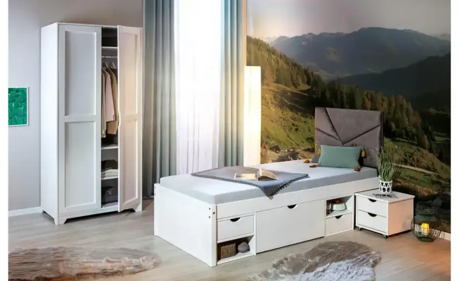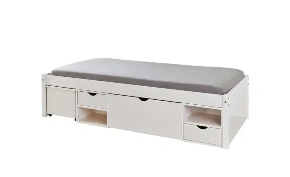 Das Funktionsbett Till sorgt nicht nur für einen erholsamen Schlaf sondern auch für Ordnung. Das praktische Stauraumbett besitzt unter der 90 x 200 Zentimeter großen Liegefläche clever unterteilten Stauraum in Form von zwei offenen Fächern und drei Schubkästen. Unter dem Kopfende steht Ihnen außerdem ein kleiner Nachttisch mit zwei weiteren Schubkästen zu Verfügung. Das gesamte Bett besteht aus massivem Kiefernholz und ist dadurch robust und langlebig.