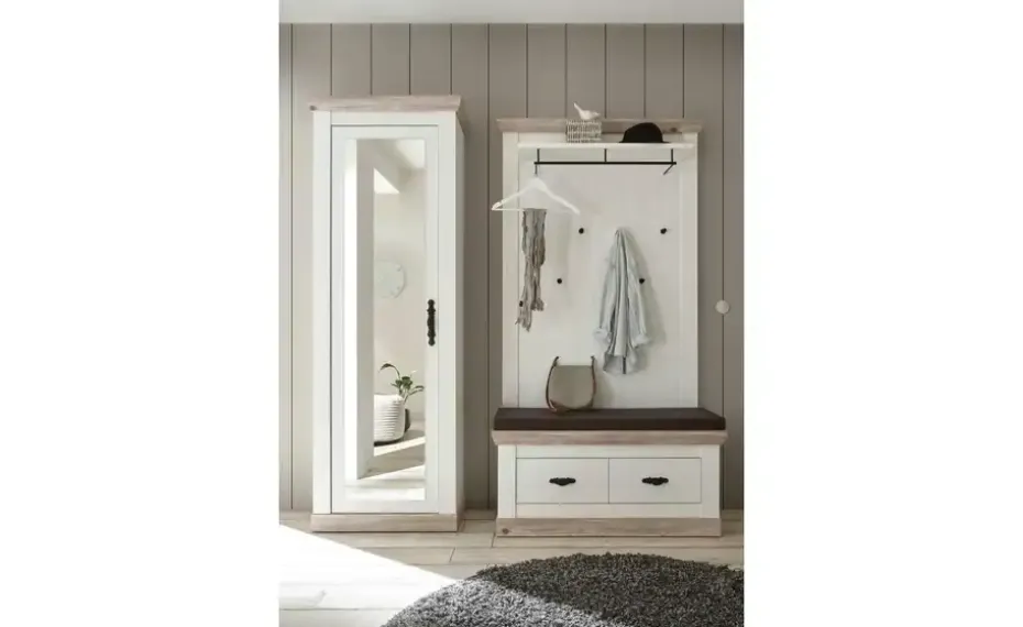 Schrank B/H/T: 73/ 201/ 38 cm; Garderobenpaneel B/H/T: 107/ 153/ 27 cm; Sitzbank B/H/T: 107/ 55 (50)/ 45 cm