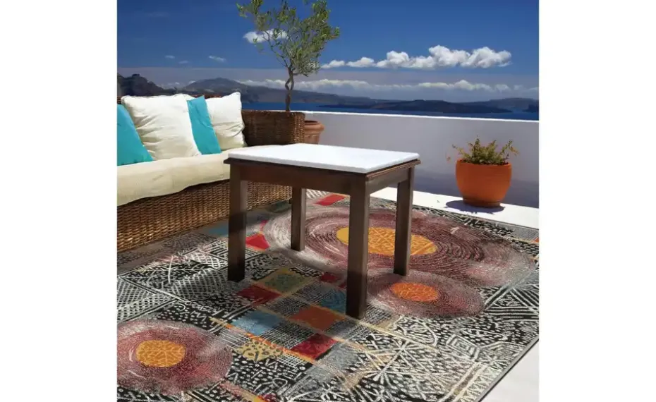 Dieser Teppich überzeugt durch ein modernes geometrisches Design, das für ein lebendiges, aber elegantes Ambiente sorgt. Dank seiner widerstandsfähigen und wasserabweisenden Materialien eignet er sich ideal für Bereiche mit hohem Durchgangsverkehr – drinnen wie draußen. Leicht zu reinigen und äußerst langlebig, ist er perfekt für Terrasse, Balkon oder Wohnzimmer, wo er durch Design und Funktionalität glänzt.