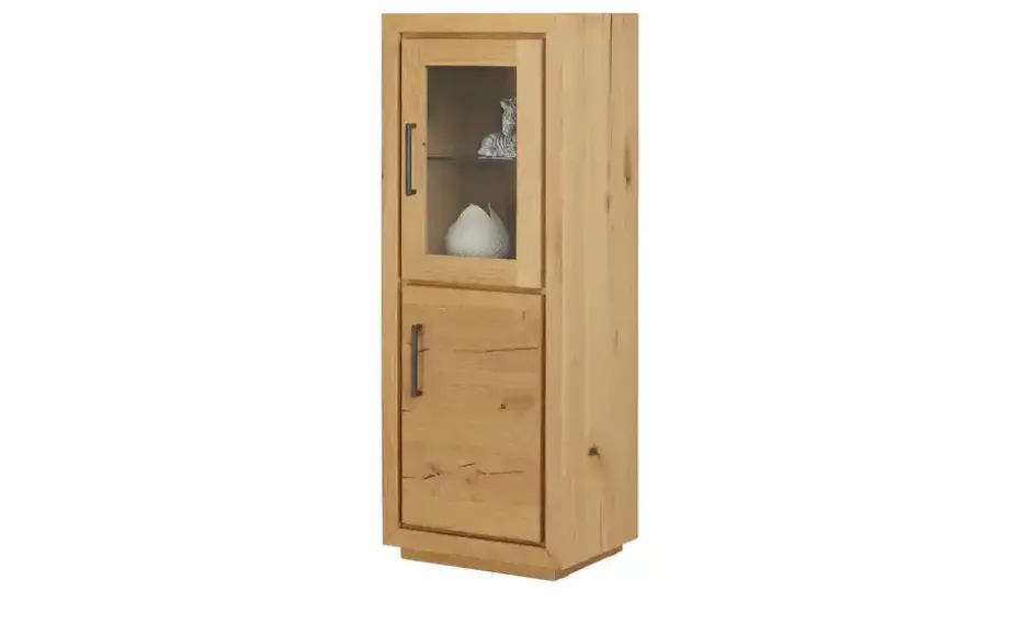 Die Vitrine Black Coast One von Gray & Jones überzeugt mit ihrer attraktiven Maserung. Die Eiche verfügt über natürliche Asteinschlüsse und Risse, die schwarz verfüllt worden sind. Front und Korpus sind mit dem schönen Echtholz furniert. Um es zu schützen ist die Holzoberfläche mit einem speziellen Lack behandelt worden. Die obere Tür ist mit Klarglas abgesetzt und bietet einen freien Blick in die beiden Vitrinenfächer.