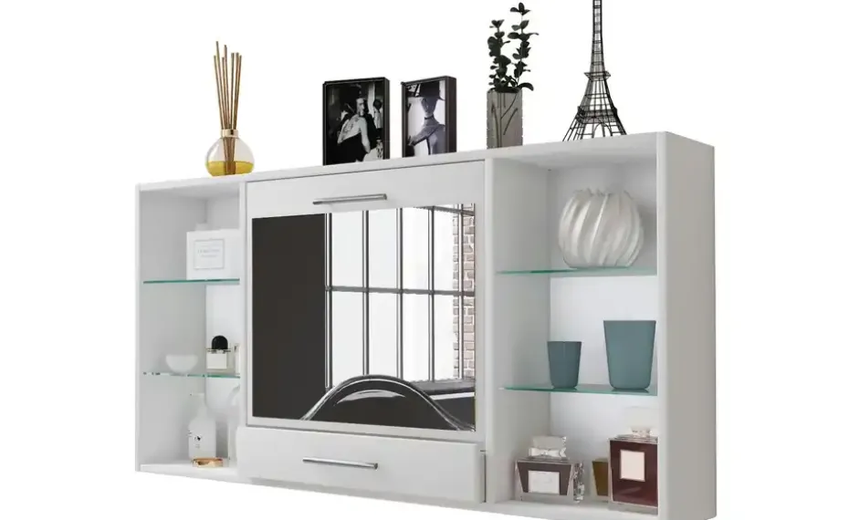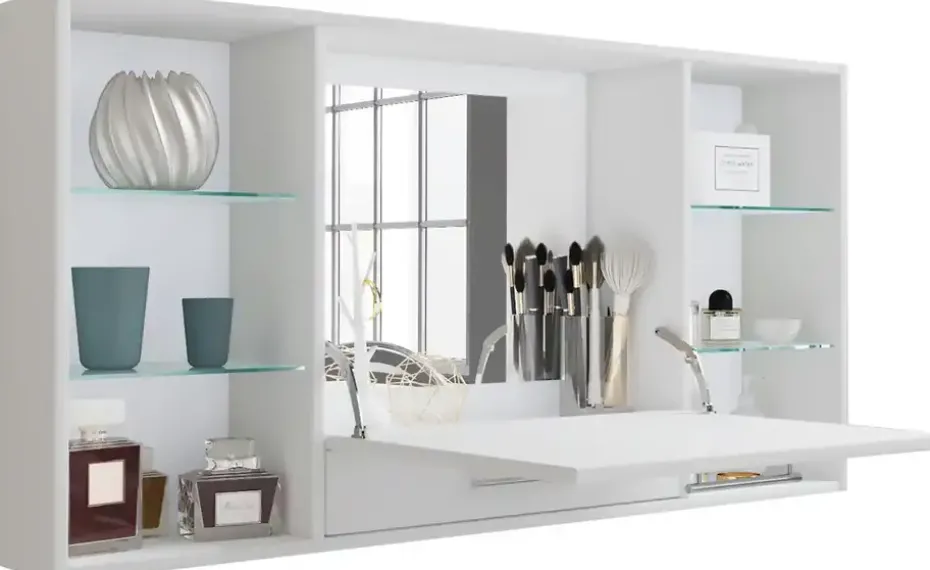 Inklusive Spiegelrückwand und Spiegel auf der Klappe