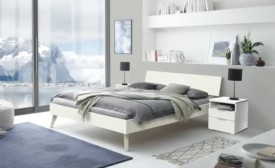 Bettgestell und Füße aus Buche weiß deckend, lackiert