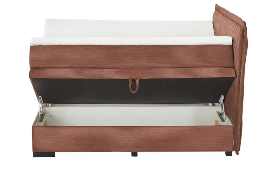 Boxspringbett mit Keder am Kopfteil in Ribcord-Bezug mit Bettkasten