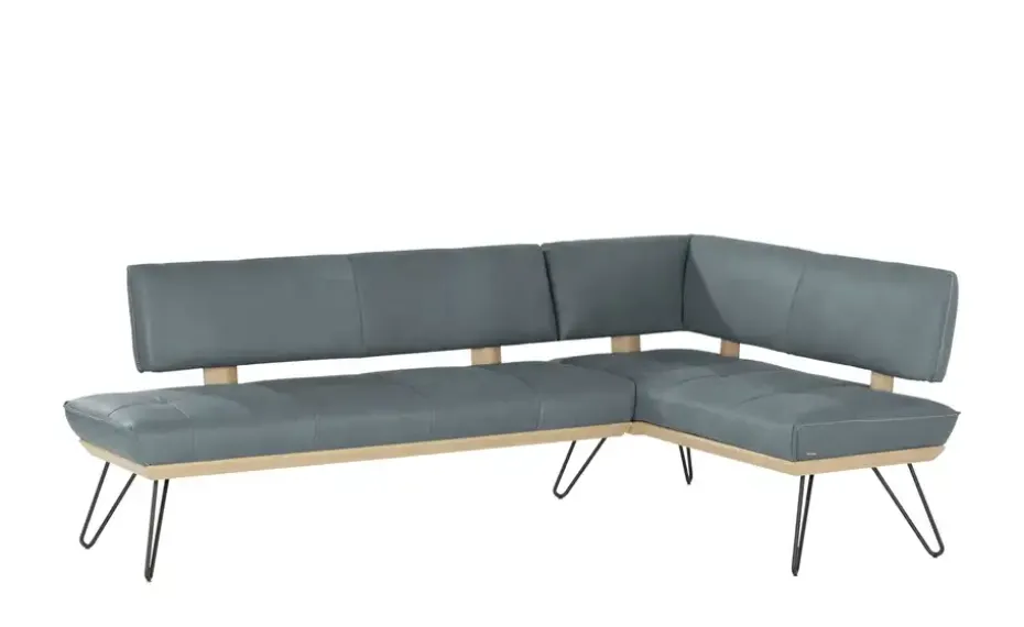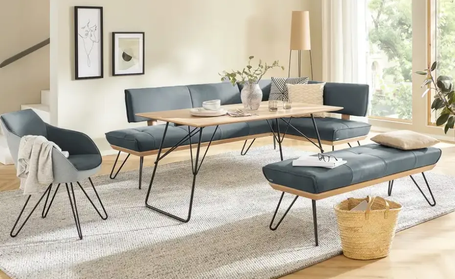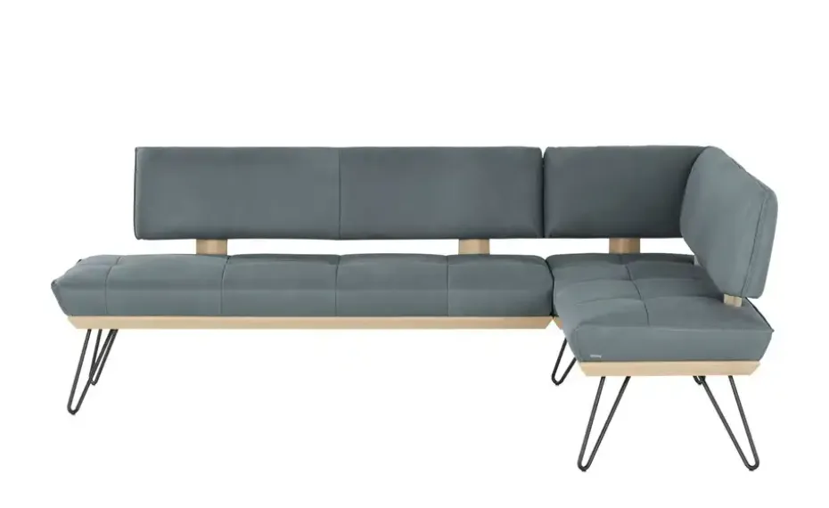Hochwertiges Büffelleder, schwarzes Metall und natürliches Echtholzfurnier aus Wildeiche: Die Eckbank Dining System 4 verbindet beste Materialien zu einem einzigartigen Design, das in zahlreiche Einrichtungskonzepte passt. Nehmen Sie auf der abgesteppten Sitzfläche Platz. Dank der komfortablen Polsterung und der zusätzlichen Wellenunterfederung können Sie hier lange bequem sitzen. Liebevolle Details, wie die Kontrastnaht im Bezug und Akzente im Büffelleder machen jede Küchen-Eckbank zu einem Unikat. Schwarze, filigrane Haarnadelfüßen tragen das furnierte Plateau mit der aufliegenden Sitzfläche und scheinen es schweben zu lassen. Unikate gefertigt in Bayern: Die Marke KOINOR steht für einzigartige Komfortfunktionen und individuelles Design. Unter Verwendung hochwertigster Materialien entstehen Möbel mit Vorzeigecharakter.