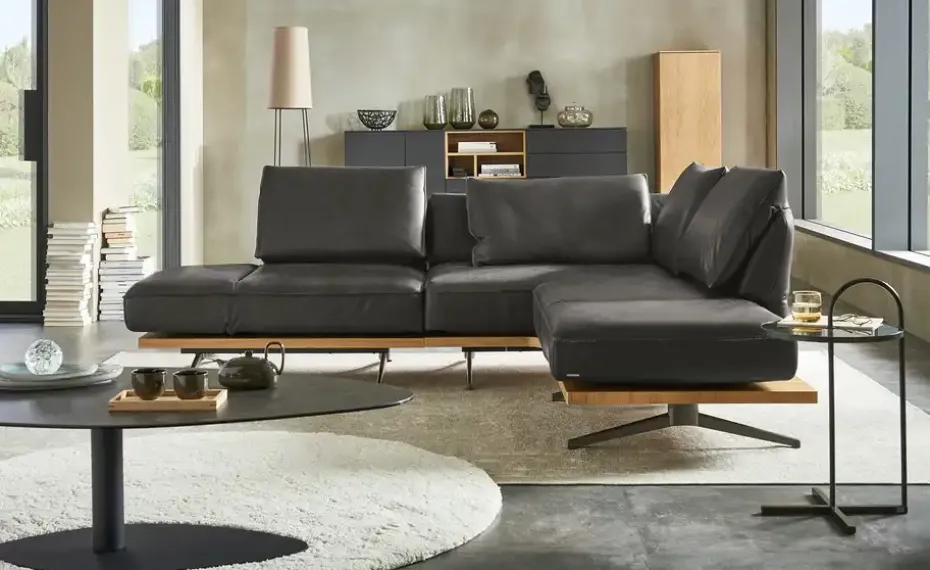 Beim Ecksofa Phoenix vereinigen sich ausgeklügelte Funktionen und exklusives Design. Dieses Zusammenspiel und liebevolle Details machen das Ecksofa Phoenix zu einem absoluten Lieblingsmöbelstück. Weiches Anilinleder zeigt die Original-Beschaffenheit der Haut. Eine dekorative Kontrastnaht setzt attraktive Akzente. Die handgearbeiteten Polster liegen auf einem Plateau mit hochwertigem Wildeichen-Furnier auf. Bronzierte Schwertkufen tragen das Plateau und scheinen das Sofa schweben zu lassen. Klappen Sie die Kopfteile und die Armlehnen ganz einfach um: Phoenix passt sich Ihren Bedürfnissen ganz individuell an. Unikate gefertigt in Bayern: Die Marke KOINOR steht für einzigartige Komfortfunktionen und individuelles Design. Unter Verwendung hochwertigster Materialien entstehen Möbel mit Vorzeigecharakter.