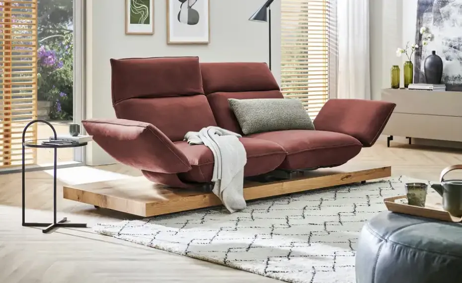 Der Zweisitzer Experio erzeugt durch sein natürliches Holzplateau eine faszinierende Art von Schwerelosigkeit. Es ist zwischen den beiden multifunktionalen Polstern durch eine attraktive Baumrindeneinlage unterbrochen. Auf Knopfdruck lassen sich die beiden Sitzbereiche ganz einfach nach links oder rechts bewegen, um hier praktische Fläche für Snacks, Fernbedienung und Co. zu schaffen. Verstellen Sie auch die Kopfteile und Armlehnen ganz nach Ihren Wünschen. So werden aus den Armlehnen bei Bedarf Fußteile, auf denen Sie bequem Ihre Beine ablegen können. Wie für Möbel der Marke KOINOR üblich, sind sämtliche Hebel und Griffe direkt im Sofa integriert, damit die Optik nicht gestört wird. Der Bezug der beiden Multifunktionspolster besteht aus hochwertigem Echtleder und ist in diversen Farben erhältlich. Unikate gefertigt in Bayern: Die Marke KOINOR steht für einzigartige Komfortfunktionen und individuelles Design. Unter Verwendung hochwertigster Materialien entstehen Möbel mit Vorzeigecharakter.