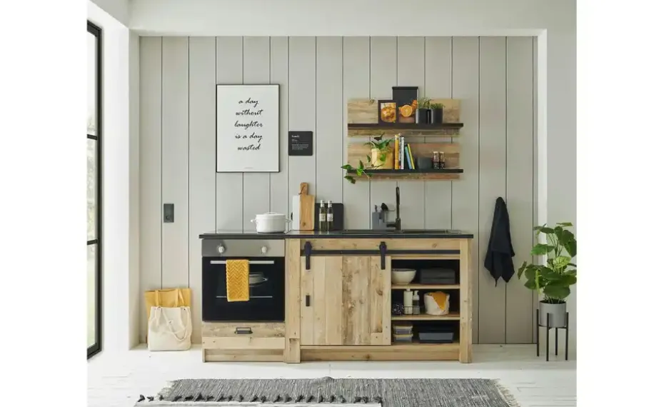 Gesamtmaße gelten für Spültisch; Wandregal: 90/22/30 cm; Herdumbau: 64/64/93 (B/T/H)
