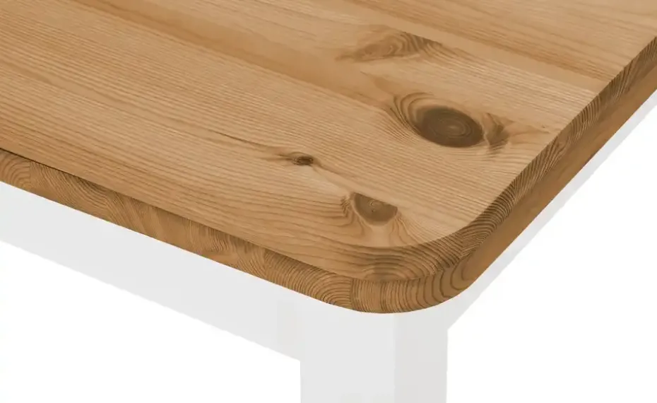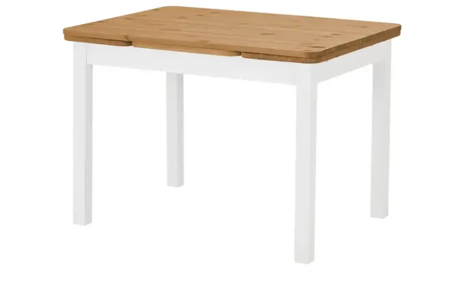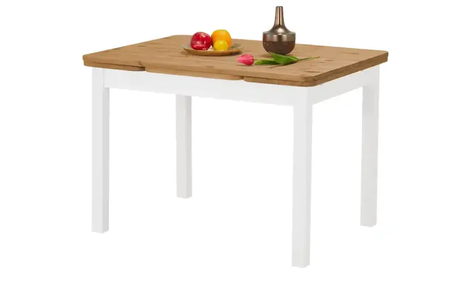 Der Esstisch ist in Kiefer massiv gefertigt. Das Gestell ist weiß lackiert und die Platte laugenfarbig, was den Landhausstil unterstreicht. Aufgrund seiner Größe ist er ideal für kleine Räumlichkeiten. Durch die beiden Ausziehplatten mit jeweils 25 cm, kann die Fläche des Tisches für ca. 6 Personen vergrößert werden.