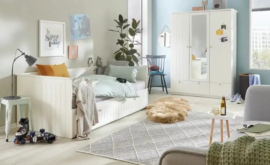 Bei dieser Möbelserie wird zeitloses Weiß mit liebevollen Akzenten kombiniert. Das Ergebnis: Kombinationsfreudige Möbel, die in nahezu jeden Einrichtungsstil passen. Durch vertikale Lamellen an sichtbaren Flächen bekommt die Serie eine attraktive Landhaus-Note. Dieser dreitürige Kleiderschrank stellt Ihnen praktischen Stauraum zur Verfügung. Fünf Fächer, eine Kleiderstange und zwei Schubfächer helfen Ihnen beim Ordnunghalten. So findet alles seinen Platz. Übrigens: Die Türen und die beiden Schubfächer schließen dank zeitgemäßem Soft-Close lautlos. Die mittlere Tür ist außerdem mit einem Spiegel versehen.