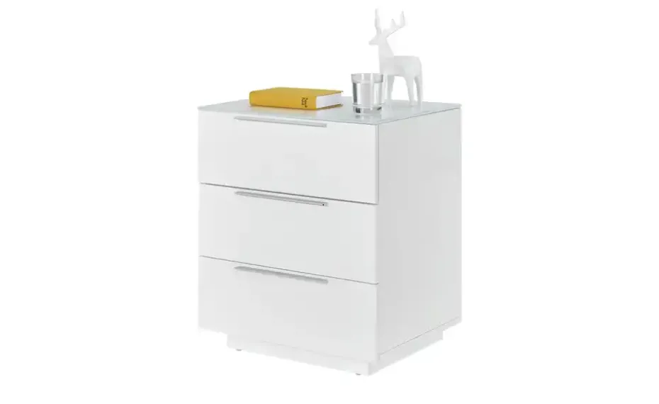 Mit ihrem klaren reduzierten Design in Weiß fügt sich die Nachtkommode Plymouth gut in vorhandene Einrichtungen ein. Ein Eyecatcher der Kommode ist die edle Hochglanzoberfläche. Die schmalen Griffleisten in Aluoptik setzen zusätzliche Akzente. Plymouth ist hochwertig lackiert; einzig die Abdeckplatte besteht aus Weißglas. Die Kommode sieht aber nicht nur attraktiv aus, sie bietet auch Stauraum: Ihnen stehen drei geräumige Schubladen zur Verfügung.