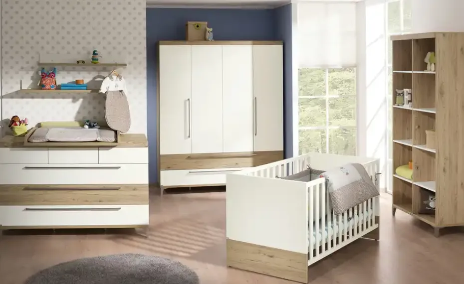 Vom Strampler bis zur Windel gibt es viele Dinge, die ein Baby benötigt. Im Kleiderschrank Remo von PAIDI ist viel Stauraum für Kleidung und vieles mehr. Durch die gute Aufteilung des Stauraumes herrscht Ordnung im Schrank. Neben den vier Türen verfügt Remo über zwei praktische Schubladen. Der Schrank ist hochwertig gearbeitet. Alle Oberflächen verfügen über eine Melaminbeschichtung. Sie zeichnet sich durch ihre Unempfindlichkeit aus. Der Korpus des Schrankes hat ein natürlich wirkendes Dekor in Eiche Bordeaux (Nachbildung). Die Front ist größtenteils kreideweiß. Eine Absetzung in Eiche Bordeaux (Nachbildung) greift die Optik des Korpus wieder auf.