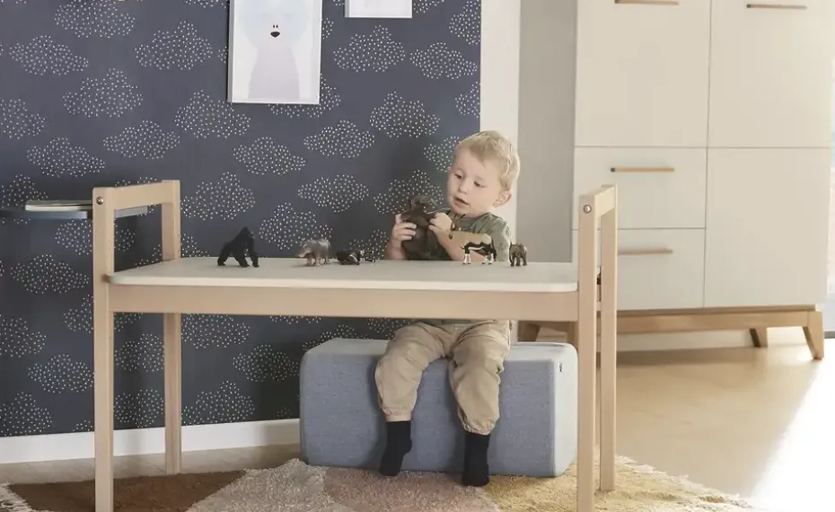Dank ergänzbarer Tischplatte entsteht ein praktischer Maltisch, der Raum für Kreativität und Spiel eröffnet.