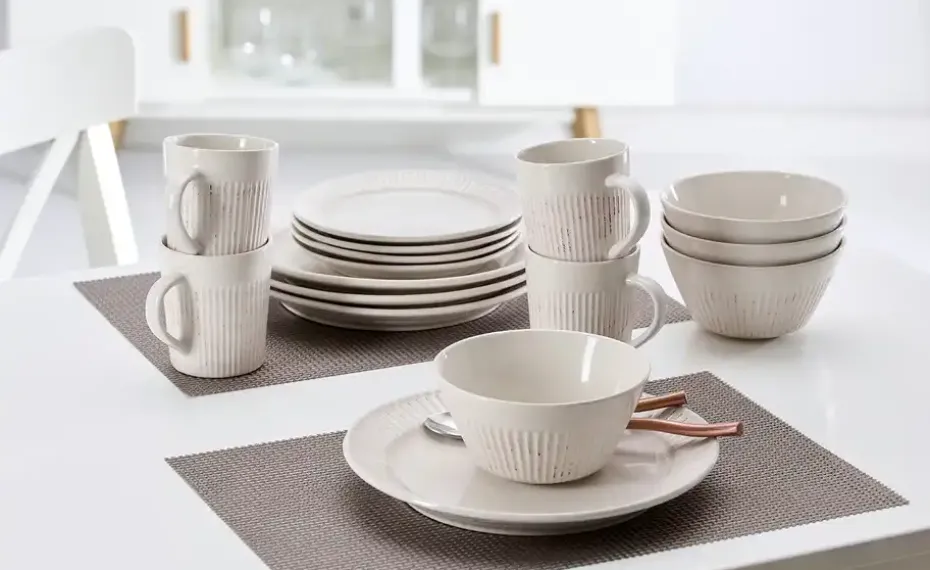 Enthält je 4 Kaffeebecher, Müslischalen, Speiseteller und Dessertteller