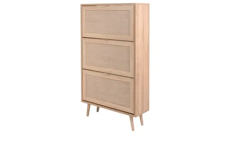 Hell, freundlich und ein kleines Raumwunder: Im Schuhschrank Rafia finden bis zu zwölf Schuhpaare problemlos Platz. Seine drei blickdichten Kipptüren sind mit einer authentisch wirkenden Bast-Geflecht-Imitation verziert. Vier schräg zulaufende Kegelfüße aus massiver Eiche geben dem Schrank einen stabilen Stand. Die Serie Rafia erinnert an den beliebten Boho-Stil und fügt sich in nahezu alle Einrichtungskonzepte problemlos ein.