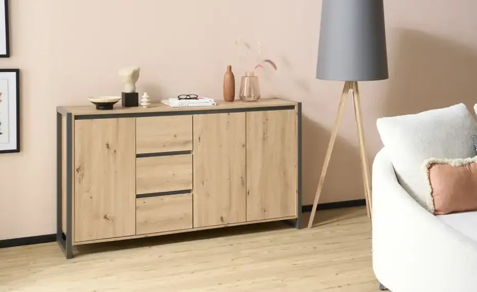 Dieses Sideboard erinnert an den beliebten Industrial Style. Sein anthrazitfarbenes Kufengestell harmoniert mit der Asteichen-Nachbildung und setzt einen gewollten Kontrast. Die drei grifflosen Türen und die drei Schubfächer lassen sich über dezente Griffmulden öffnen. Insgesamt steht Ihnen Stauraum in vier Fächern und in drei Schubfächern zur Verfügung. Platzieren Sie das Sideboard in Wohn-, Schlaf-, oder Arbeitszimmer: Es ist vielseitig einsetzbar und passt in diverse Raumkonzepte.