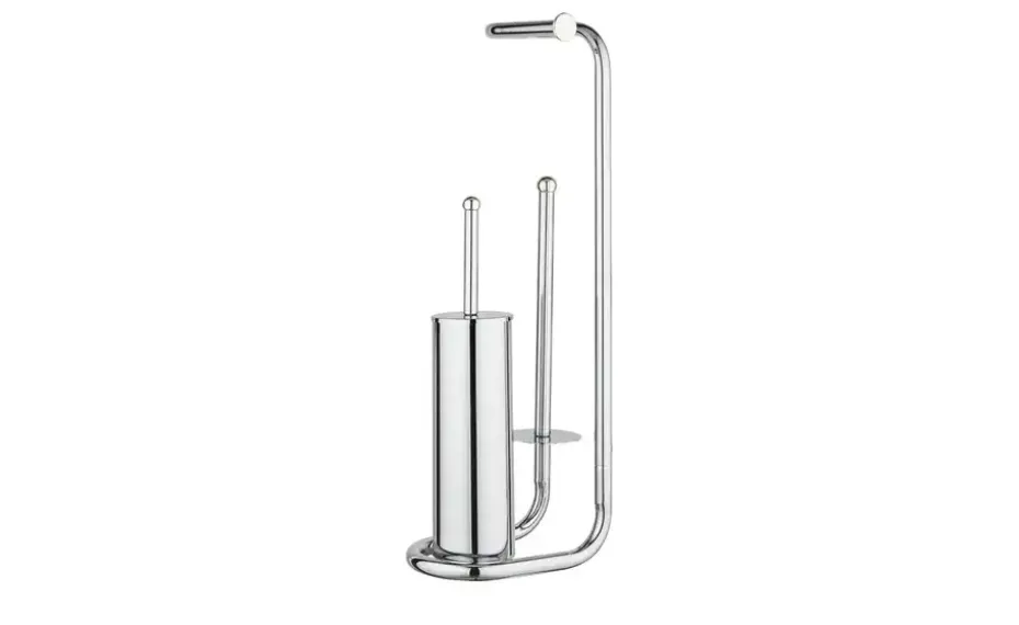 Die Stand WC-Garnitur Universalo setzt dekorative Design-Akzente im Badezimmer. Sie ist eine praktische 3 in 1 Kombination bestehend aus einem geschlossenen WC-Bürstenhalter, einem offenem Toilettenpapierrollenhalter für die sofortige Entnahme und einem separaten Ersatzrollenhalter für die Aufbewahrung von bis zu 3 weiteren Rollen. Im Lieferumfang ist die WC-Bürste mit weißem, auswechselbarem Bürstenkopf von Ø 7,5 cm und Chrom-Stiel enthalten.