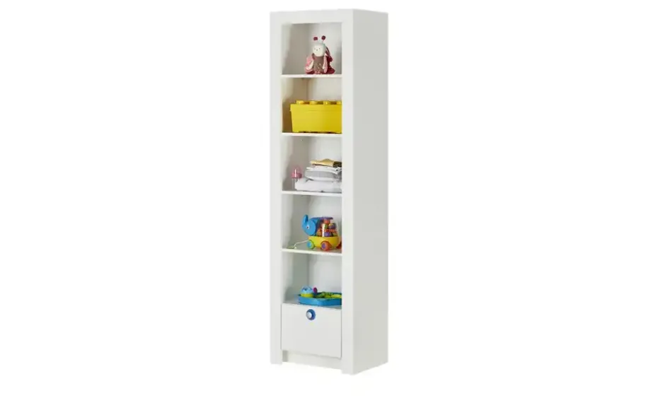 Das Standregal Charlie bietet praktischen Stauraum im Babyzimmer. Sie können die fünf geräumigen Fächer für Spielzeug nutzen. Aber auch Ordnungsboxen passen in die Fächer. Im unteren Bereich des Regals befindet sich außerdem eine Schublade. Toll: Zwei Unterplatten für den Griff sind im Lieferumfang enthalten – eine in Rosa und eine in Blau. Damit können die dem sonst weißen Regal einen Farbakzent geben.