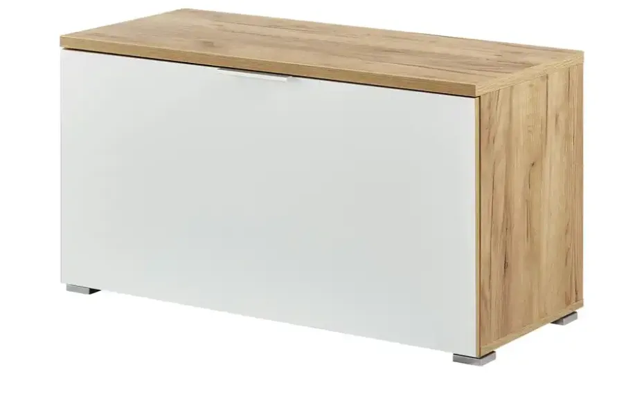 Die Garderobenbank Bent von uno ist gleich doppelt praktisch für Ihren Flur. Sie können darauf sitzen und Sie können Schuhe darin verstauen. Die Front besteht aus einer großen Klappe. Dahinter verfügt Bent über vier Fächer. In denen finden etwa acht Paar Schuhe einen Platz. Korpus und Sitzfläche haben ein Dekor in Navarra Eiche (Nachbildung). Die Front setzt sich in Weiß ab – wobei die Oberfläche aus edlem Glas besteht.