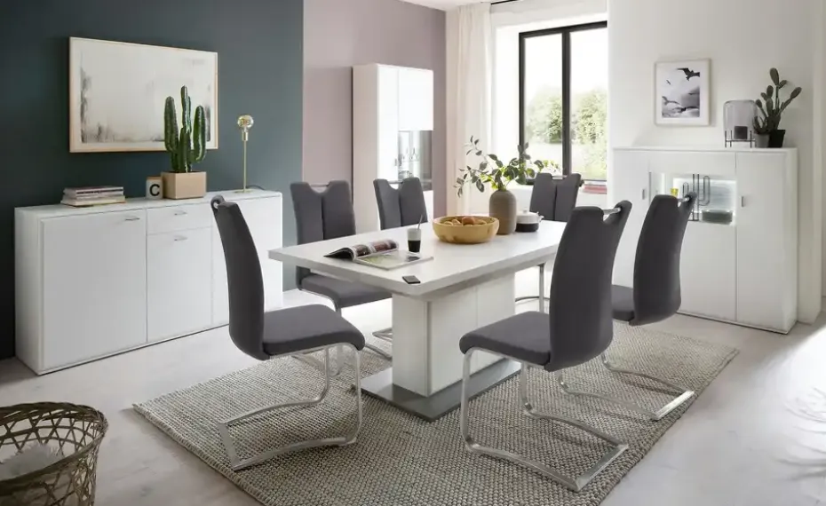 Mattweiße Fronten, ein gradliniges Design und moderne Metallgriffe machen das Highboard Ramon zeitlos und kombinationsfreudig. Die Fronten sind mit kratzerunempfindlichem Melamin beschichtet und besitzen abgerundete Ecken. Mittig wird die blickdichte Front durch ein Vitrinenfenster unterbrochen. Hier können Sie Vasen und andere Lieblingsobjekte gekonnt in Szene setzen. Blickdichter Stauraum steht Ihnen außerdem in insgesamt zehn Fächern zur Verfügung. Unser Tipp: Unter Zubehör finden Sie die passende LED-Rückwandbeleuchtung für den Vitrinenteil. So wird das Vitrinenfach zur Bühne für Ihre Lieblings-Dekoration.