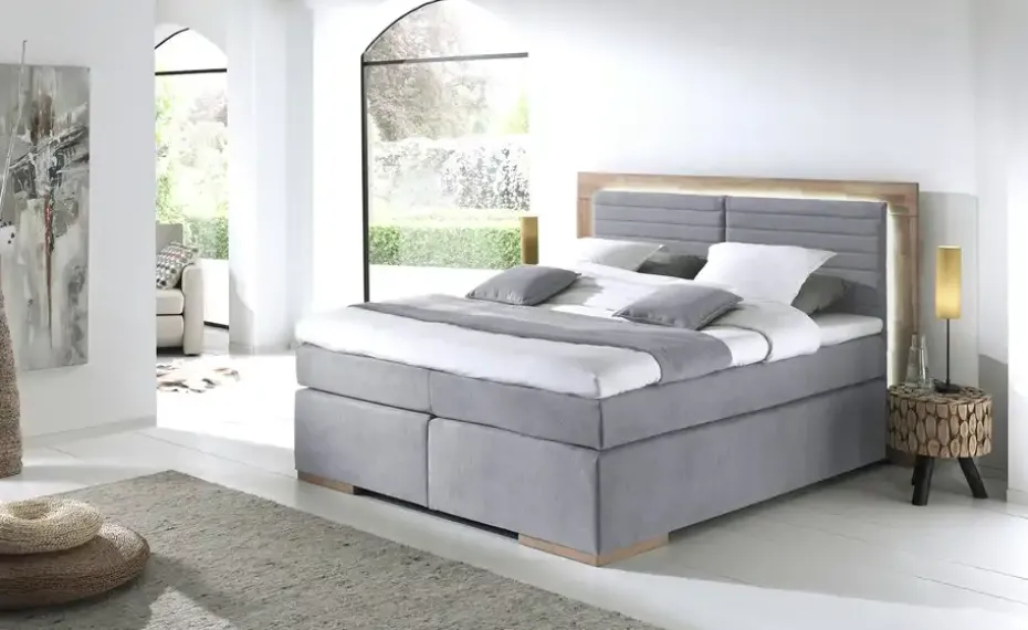 uno Massivholz-Boxspringbett mit LED-Beleuchtung Marlow | Hellgrau, 160 cm