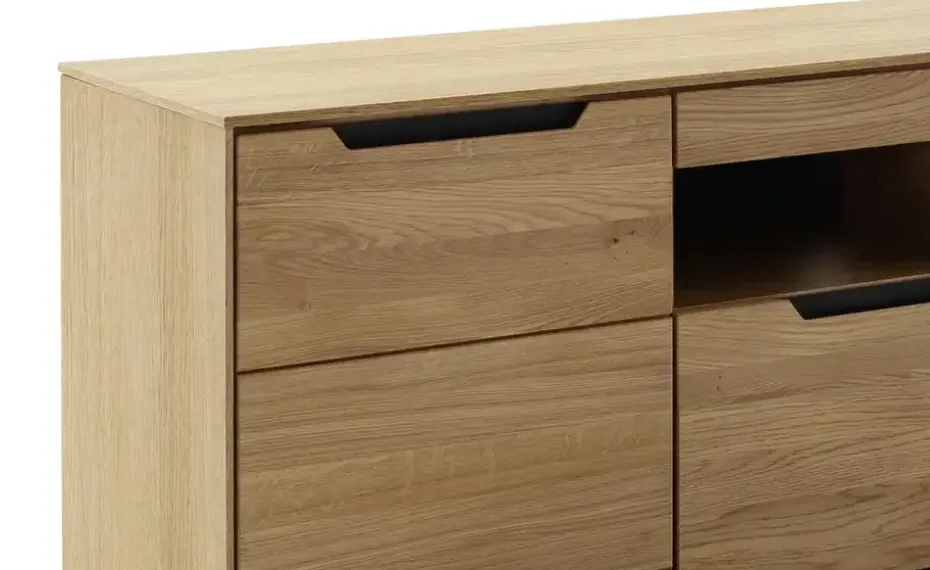 Korpus außen aus Holzwerkstoff furniert mit Massivholzanleimer in Eiche / innen Holzwerkstoff foliert in Eiche (Nachbildung)