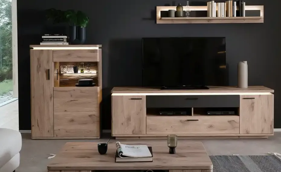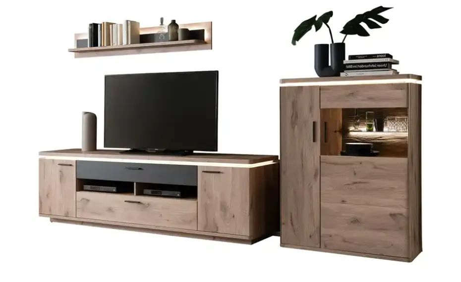 uno Wohnkombination Kataros | mit Absetzung in Anthrazit, Schubkastendämpfer, Kabeldurchlass/Kabelkanal