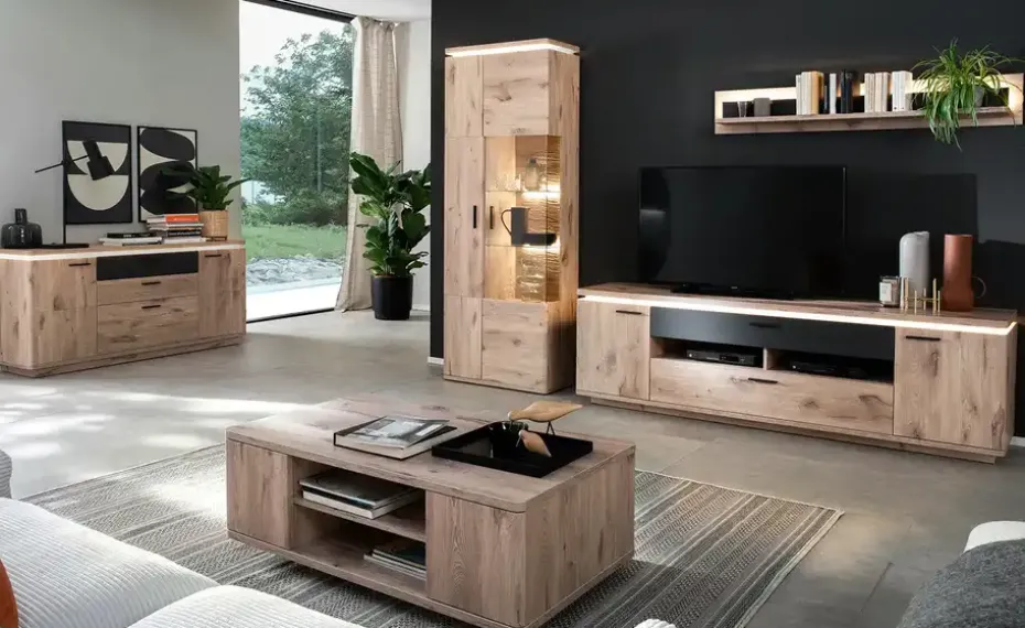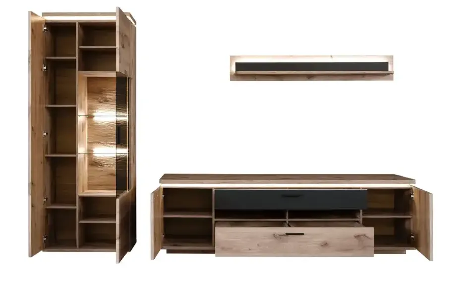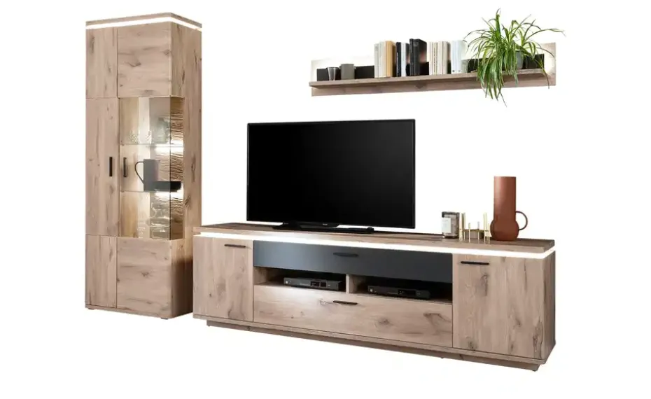 uno Wohnkombination Kataros | mit Absetzung in Anthrazit, Schubkastendämpfer, Kabeldurchlass/Kabelkanal