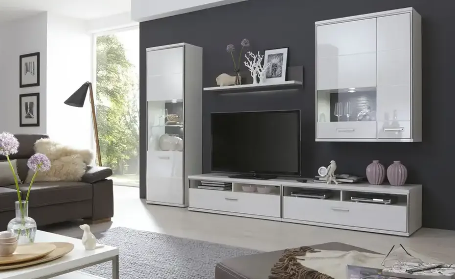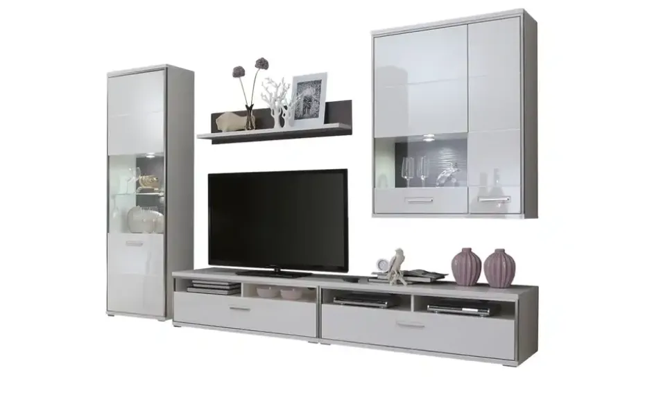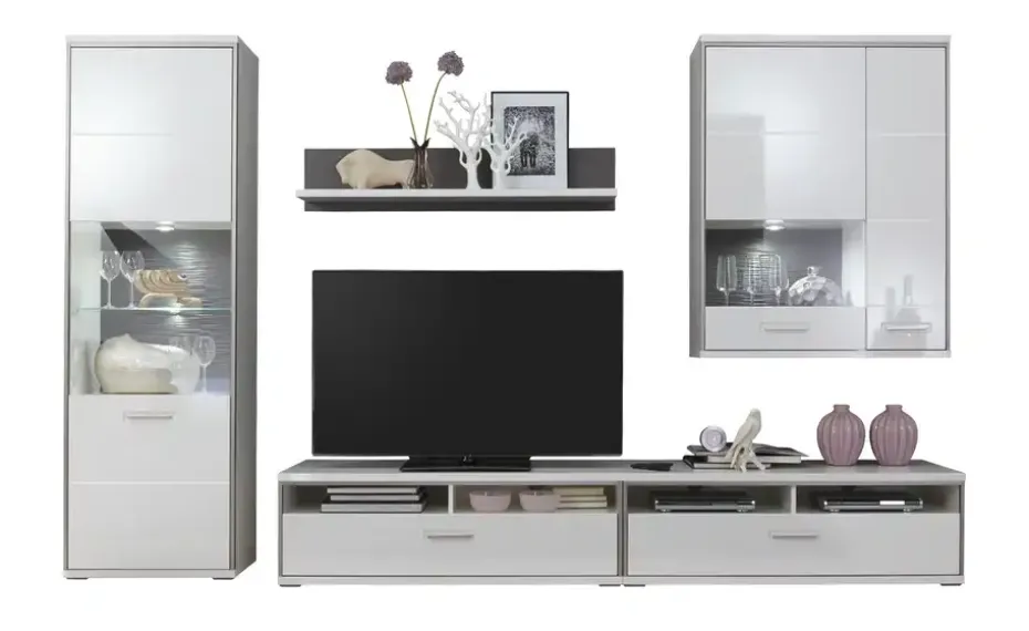 Die Wohnwand Setto von uno ist ein optisches und praktisches Highlight für Ihren Wohnraum. Setto ist in einem puristischen Weiß gehalten – und wird durch graue Akzente abgesetzt. Sie stellen einen schönen Kontrast zum Weiß dar. Hinzu kommen Akzent-Rahmen in Edelstahloptik. Die Wohnwand besteht aus fünf Elementen, die Sie nach Herzenslust platzieren können. So bietet Ihnen Setto diverse Gestaltungsmöglichkeiten. Wie Sie sich auch entscheiden, mit Setto erhalten Sie praktischen Stauraum für alles, was Sie unterbringen möchten. Auch Stellfläche für Ihren Fernseher und weitere Ablagen sind vorhanden. Präsentieren Sie Lieblingsdeko hinter Glas. Die Vitrinenfächer machen es möglich.