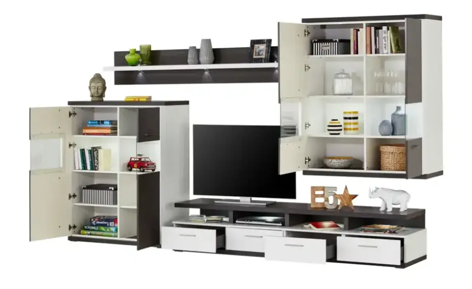 Modern und kontrastreich ist die Wohnkombination Titan. Das strahlende Weiß Arctic und das dunkle Graphitgrau setzen sich voneinander ab. Ein weiterer Kontrast sind die Oberflächenbeschaffenheiten. So sind die weißen Fronten hochglänzend. Die graphitgrauen Absetzungen an der Front fallen durch die geriffelte Schropphobelung auf. Auch die weißen Rückwände der Vitrinenfächer haben eine geriffelte 3D-Optik.Titan überzeugt durch vielseitige Staumöglichkeiten – offen und geschlossen. Zu der Kombination gehören ein Highboard, zwei TV-Unterteile mit übergreifendem TV-Aufsatz, ein Hängeelement und ein langes Wandpaneel. Die passende Korpusfrontbeleuchtung ist im Lieferumfang enthalten.