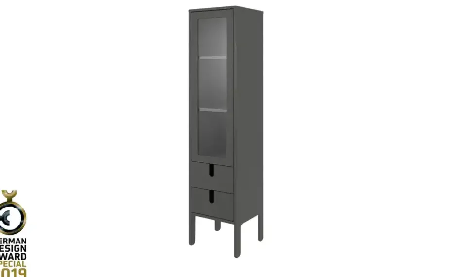 Präsentieren Sie Ihre Lieblingsstücke in einer Vitrine, die auch selbst ein Lieblingsstück sein kann. Uno ist mit dem German Design Award Special 2019 ausgezeichnet worden. Und das nicht ohne Grund: Die klare, auf das Wesentliche reduzierte Form wird mit einem modernen Farbton kombiniert. Der Lack hat ein mattes Finish, wodurch das Grau noch besser zur Geltung kommt. Neben den drei Vitrinenfächern im oberen Bereich bietet Uno Stauraum in zwei Schubladen.
