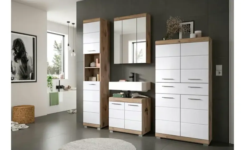 Ergänzen Sie Ihr Badezimmer mit einem eleganten und funktionalen Waschbeckenunterschrank. Mit seinen Maßen von 37x191x31 cm bietet dieses Möbelstück eine stilvolle Lösung für die Aufbewahrung Ihrer Badutensilien. Die Front in weißem Hochglanz verleiht dem Unterschrank ein modernes und hochwertiges Erscheinungsbild. Kombiniert mit Akzenten in Nox Oak Nachbildung entsteht ein harmonisches Design, das sich in jede Badeinrichtung einfügt. Hinter den zwei Türen verbergen sich zwei geräumige Fächer, die ausreichend Platz für Handtücher, Reinigungsmittel oder andere Utensilien bieten. Gefertigt aus FSC®-zertifiziertem Holzwerkstoff, steht dieses Möbel für Nachhaltigkeit und Umweltschutz. Es verbindet hochwertige Verarbeitung mit einem Beitrag zur Schonung unserer Wälder. Machen Sie Ihr Badezimmer zu einem Ort der Ruhe und des Designs – mit diesem zeitlosen Waschbeckenunterschrank, der Funktionalität und Ästhetik perfekt vereint!